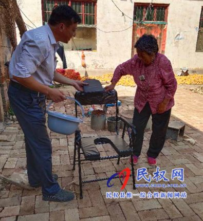 “9月29日上午,民權(quán)縣委組織部幫扶干部為貧困戶講解方便椅使用方法。據(jù)悉,褚廟鄉(xiāng)柘桑村貧困戶馬瑞蘭身體殘疾,行動(dòng)不便,幫扶干部靳勝華自費(fèi)購買方便椅并送其家中。馮濤”...